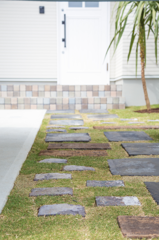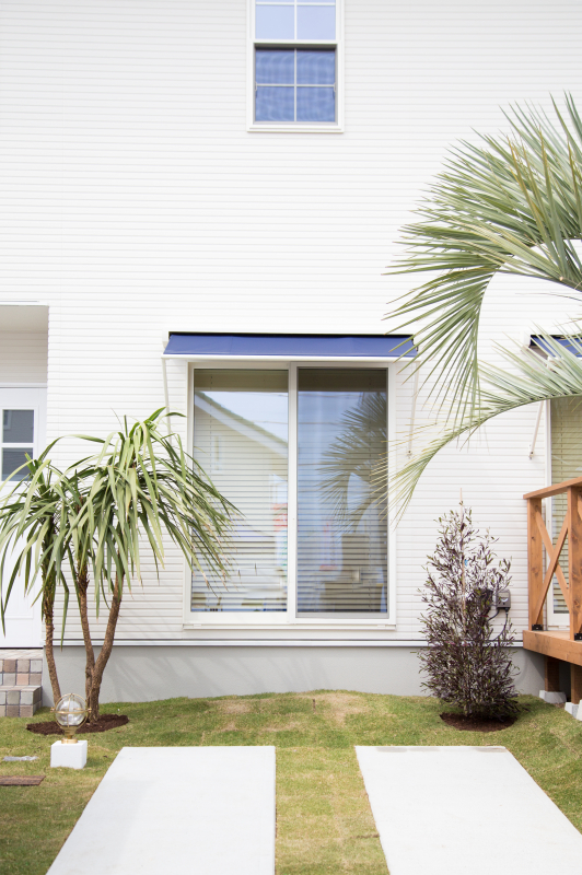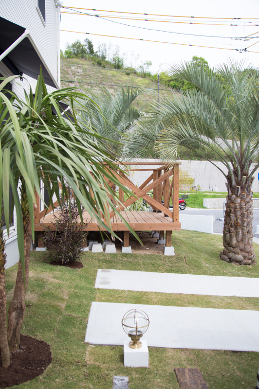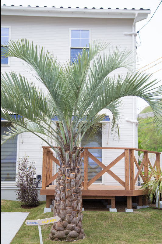 南国テイストの木と鮮やかなグランドカバー。 コバルトブルーの海と サーフボードが似合うお庭が完成しました。 大きなヤシが 非日常的な空間を感じさせてくれます。