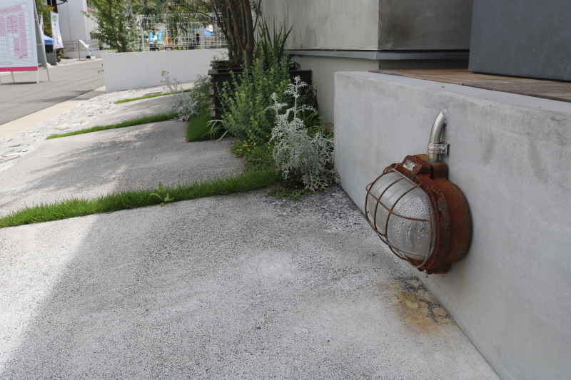 観葉植物や雑貨を玄関先の広いデッキに置いて楽しむ新しいお庭。 インダストリアルな工業ランプや鋼材をガーデンアイテムに使用し、 錆や経年変化も楽しめます。